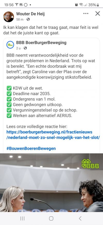 Het huidige vergunningssysteem is niet meer houdbaar. Zelfs verduurzaming loopt vast, en recreatieve activiteiten zoals wandeltochten komen in de knel. Daarom wil het kabinet na de zomer een nieuw vergunningsstelsel presenteren dat is gebaseerd op een beter inzicht in de staat van de natuur en alle bijhorende drukfactoren. Ook kijkt het kabinet voor de langere termijn naar het herijken van Natura 2000-gebieden.