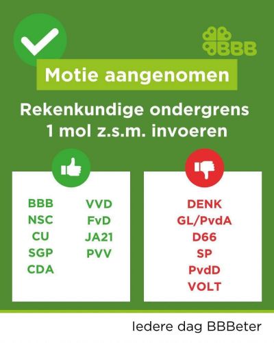 Motie vd Plas, zo snel mogelijk 1 mol ondergrens invoeren aangenomen