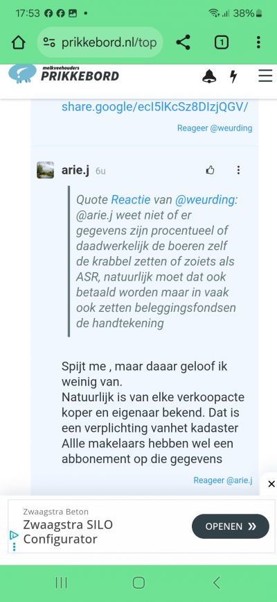Hebben de thema's koeien , melkproductie , rabobank , melkveebedrijven en nederland geen geheimen voor jou? Dan kunnen we jouw kennis en inzicht goed gebruiken! Of je nu actief bijdraagt door foto's, video's, topics of reacties te plaatsen, of je zorgt er middels de stemknoppen voor dat de beste reactie naar boven borrelt.. Jouw kennis en inzicht m.b.t. de melkveehouderij kunnen deze site nét dat beetje beter maken. Maak ook een (gratis) account aan!