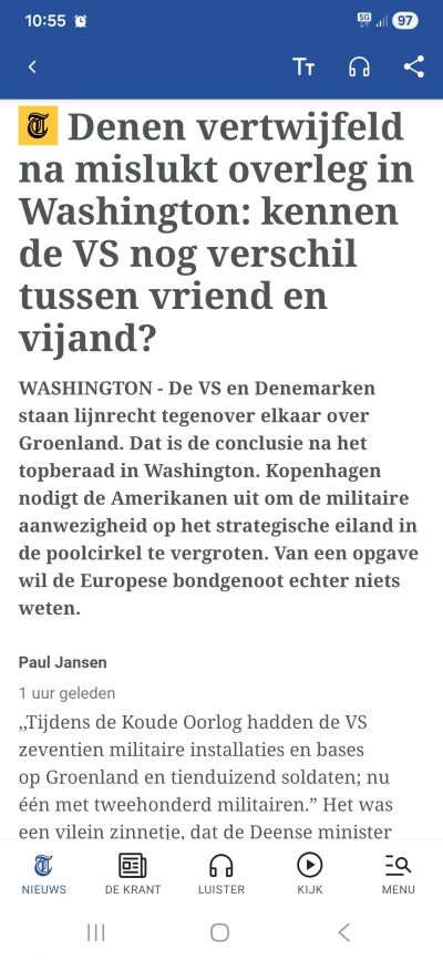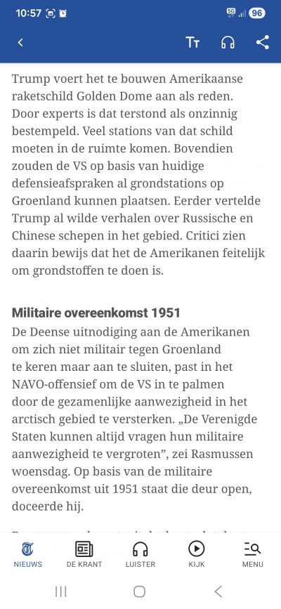 Het gedram van Trump omtrent Groenland is eigenlijk niet te snappen. Zij zitten daar al met militaire bases en het nodige matereel en veel bevoegdheden, mede door het NAVO bondgenootschap. Wat is de noodzaak dan om de toestand zo op de spits te drijven binnen de NAVO? Hoogmoedswaanzin, dezelfde ziekte waar o.a. Putin en Xi ook aan lijden.