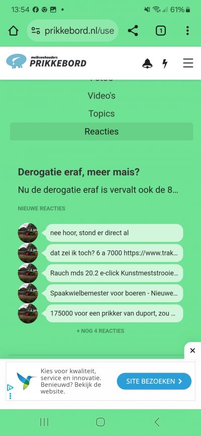 Hebben de thema's Mais , grasland , derogatie en verbouwen geen geheimen voor jou? Dan kunnen we jouw kennis en inzicht goed gebruiken! Of je nu actief bijdraagt door foto's, video's, topics of reacties te plaatsen, of je zorgt er middels de stemknoppen voor dat de beste reactie naar boven borrelt.. Jouw kennis en inzicht m.b.t. de melkveehouderij kunnen deze site nét dat beetje beter maken. Maak ook een (gratis) account aan!