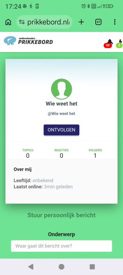 Hebben de thema's melkvee , fosfaat en veestapel geen geheimen voor jou? Dan kunnen we jouw kennis en inzicht goed gebruiken! Of je nu actief bijdraagt door foto's, video's, topics of reacties te plaatsen, of je zorgt er middels de stemknoppen voor dat de beste reactie naar boven borrelt.. Jouw kennis en inzicht m.b.t. de melkveehouderij kunnen deze site nét dat beetje beter maken. Maak ook een (gratis) account aan!